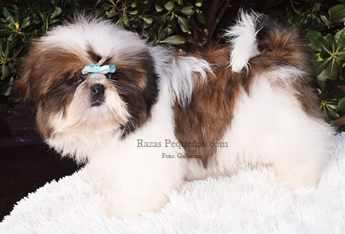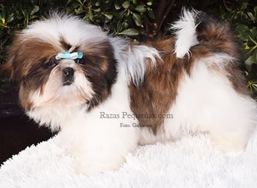 Descripción: Cuerpo de longitud media, pelo de la cabeza recogido en coleta alta decorativa con lazo. Estilo clásico y elegante del Shih Tzu tradicional.